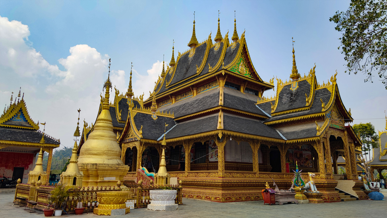 结束后,我们来到沧源县城,参观【广允缅寺】,他是第三批国保,保留了小乘佛教寺院的基本形式,过厅柱上两条木雕金色巨龙盘旋而下,气势非凡。壁画,藻井,无不流露出厚重的历史人文气息;之后来到【永和口岸】,感受独特的边陲历史文化景观;之后来到【葫芦小镇】,写满佤文的佤历柱,画着崖画的崖画柱,记载着佤族大事记的记事柱;火塘柱、劳作柱、狩猎柱、民居柱,无一不展现着佤族文化的厚重。