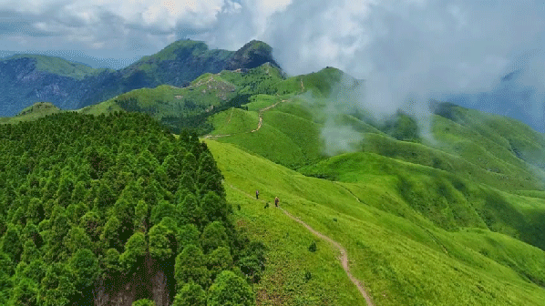 满眼翠绿的高山草甸,云雾飘渺的山巅