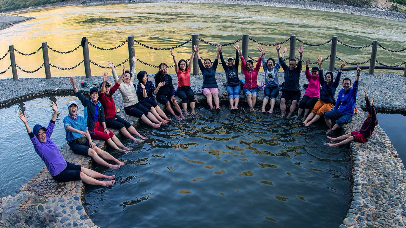 之后驱车直下,抵达【澡塘会址】,这是怒江特有的天然温泉群。每年春节初二到初七,附近的傈僳人,相聚到此,男女老少互不避讳,自然洗浴,互聊家常,其乐融融,与旁边兀自奔流的怒江和谐共存。有诗赞“男女不避温泉浴,洗却风尘净心灵”。