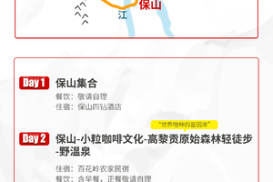 之后前往【百花岭】,走进小众秘境——高黎贡山,这里有着尚未开发的【野生温泉】—阴阳谷温泉!高黎贡山被誉为“世界物种的基因库”,原始森林中,物种何其丰富。飞溅的瀑布打在野芭蕉叶上,变成一颗颗晶莹剔透的露珠滑落。深山中,迷雾缭绕,两眼温泉从火山岩层间涌出!每到过年过节的时候,当地人就会来到这里,用温泉水祛病养生!我们要在这里感受空谷幽林,鸟儿齐鸣的森林泡汤。