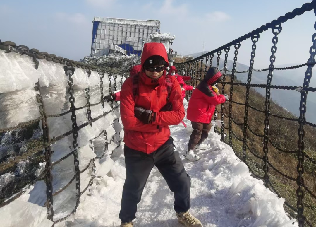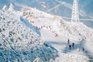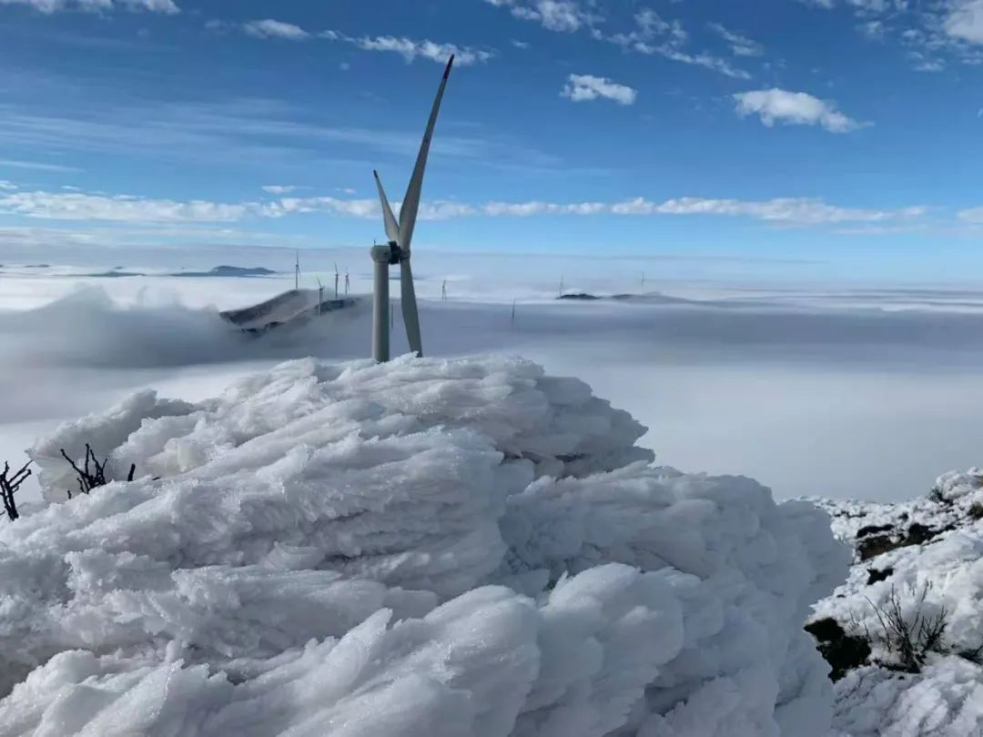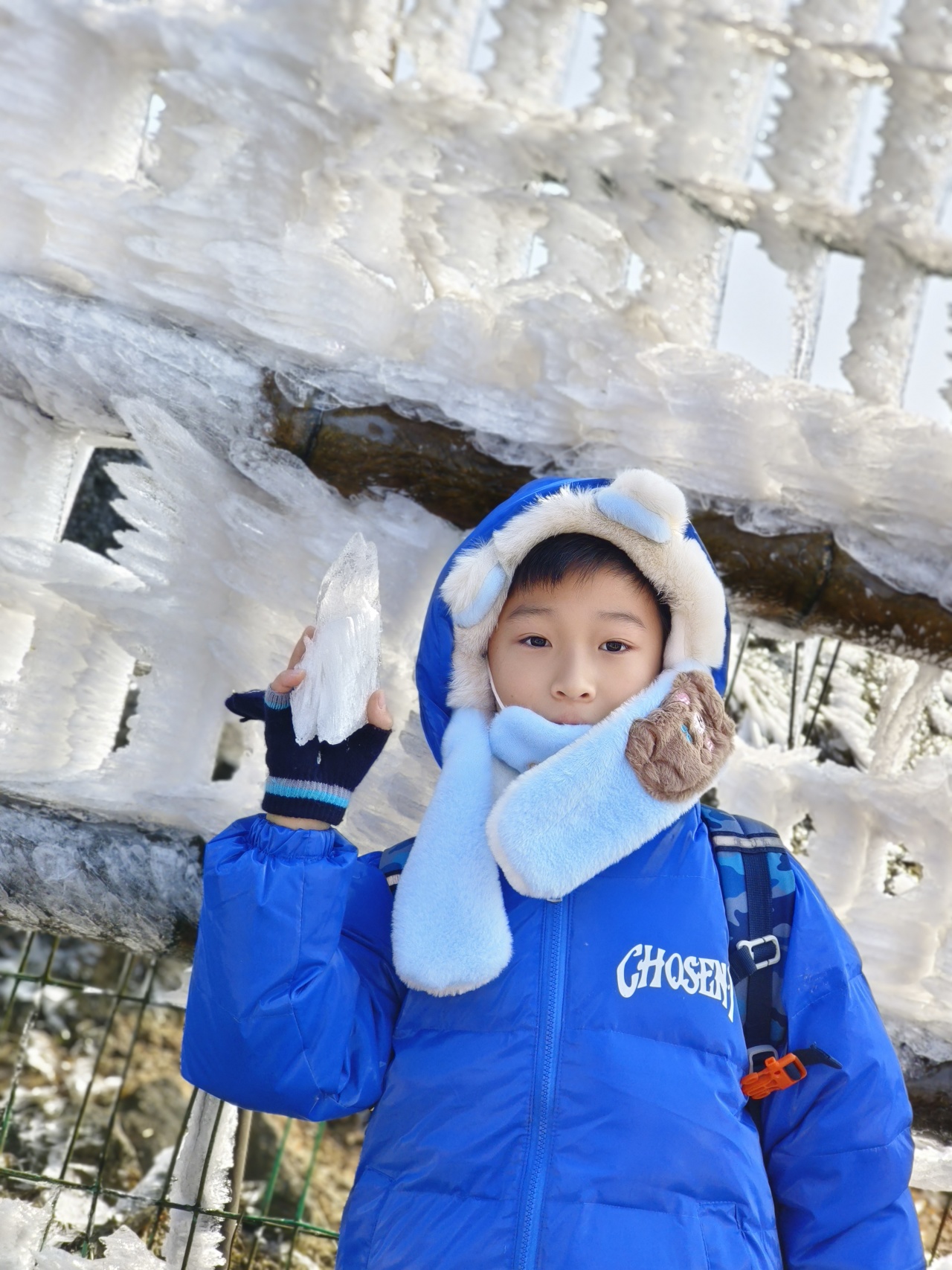 12:00 左右到达云冰山。开始从竹林雾凇观赏,领队带着大家前往山顶,都是水泥路难度不大哦(路边结冰需要配冰爪,山脚有卖)漫步在大风车下看漫山遍野的冰封世界,四周的苔藓,植被的冰挂。(体验捏雪球和掰冰棒的快乐)走过冰封铁索桥,最后登顶“一脚跨两省”标志观景台,一路雪景奇观拍照不停。(可以坐车上山腰,如遇道路结冰等恶劣天气,景区中转车暂停运营且费用没的退,徒步上顶约3公里40分钟左右);