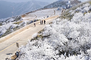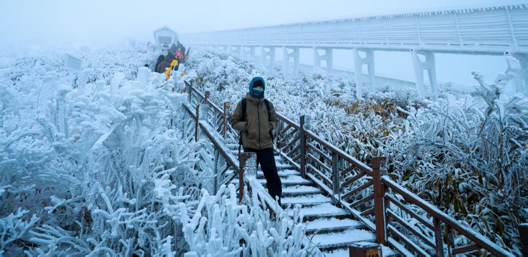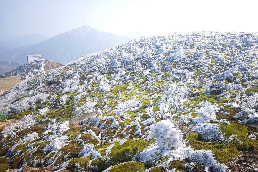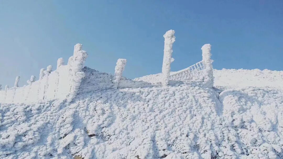 每逢冬季,整个山间晶莹剔透,露珠在低温下迅速凝结成冰,在风力的作用下,漫山遍野的植被被晶莹剔透的冰挂包裹,山顶、栈道、栏杆上也覆盖着厚厚的白霜。