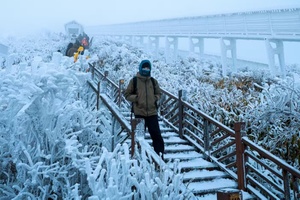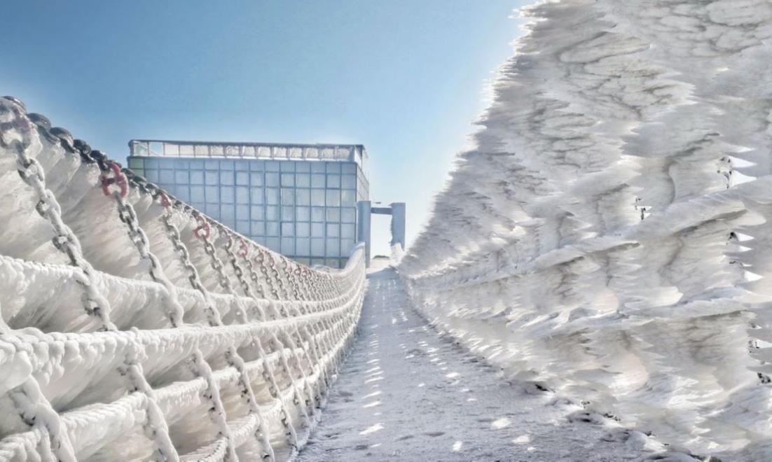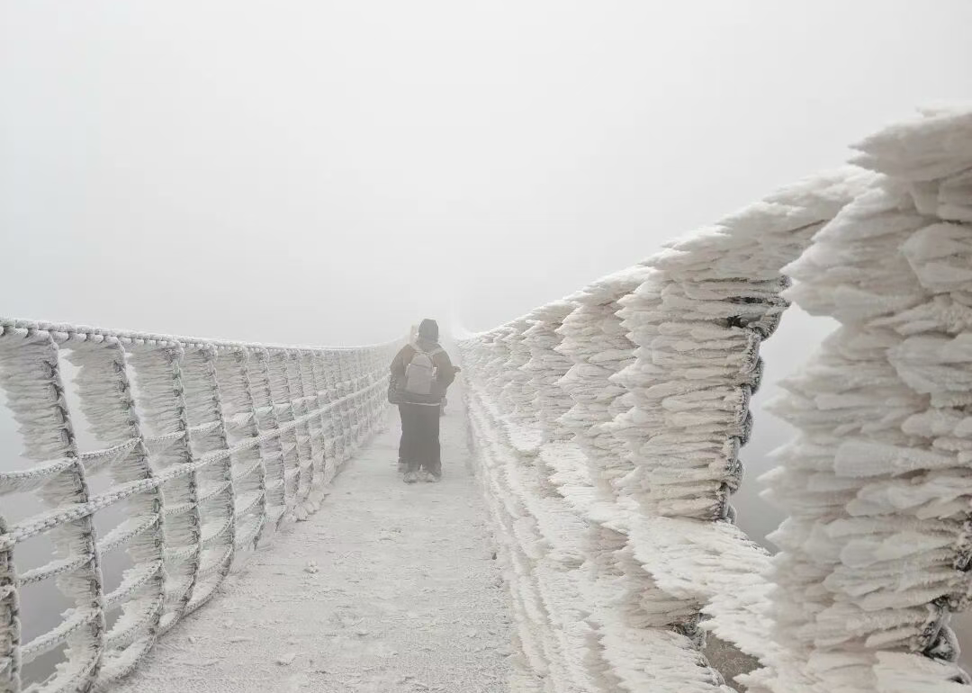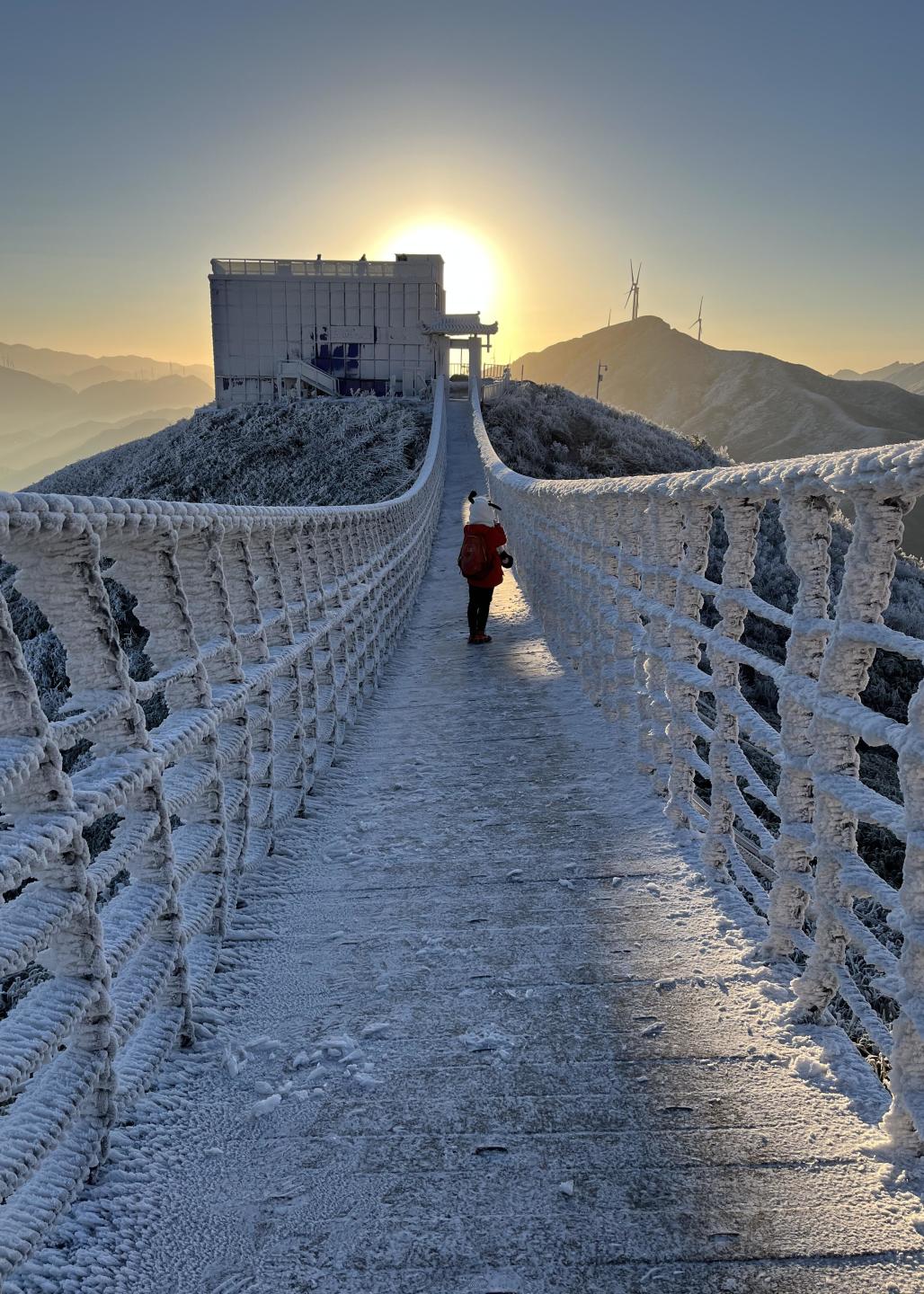 冬季整座桥都被晶莹的冰雪包围,景象胜似北极风光,我们行走其上,脚下是翻腾的云海,腾云驾雾。