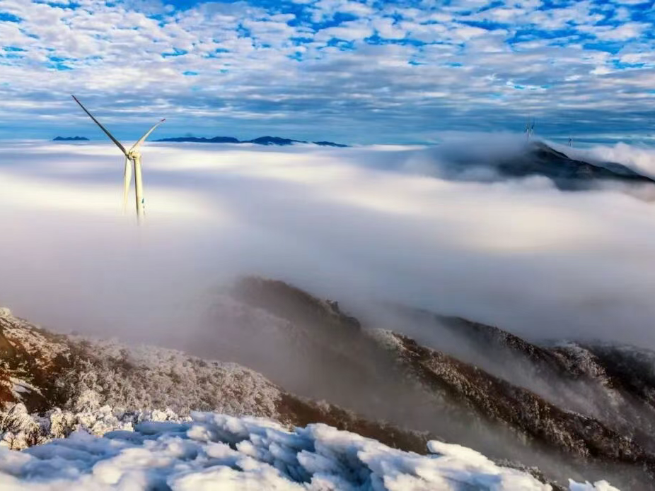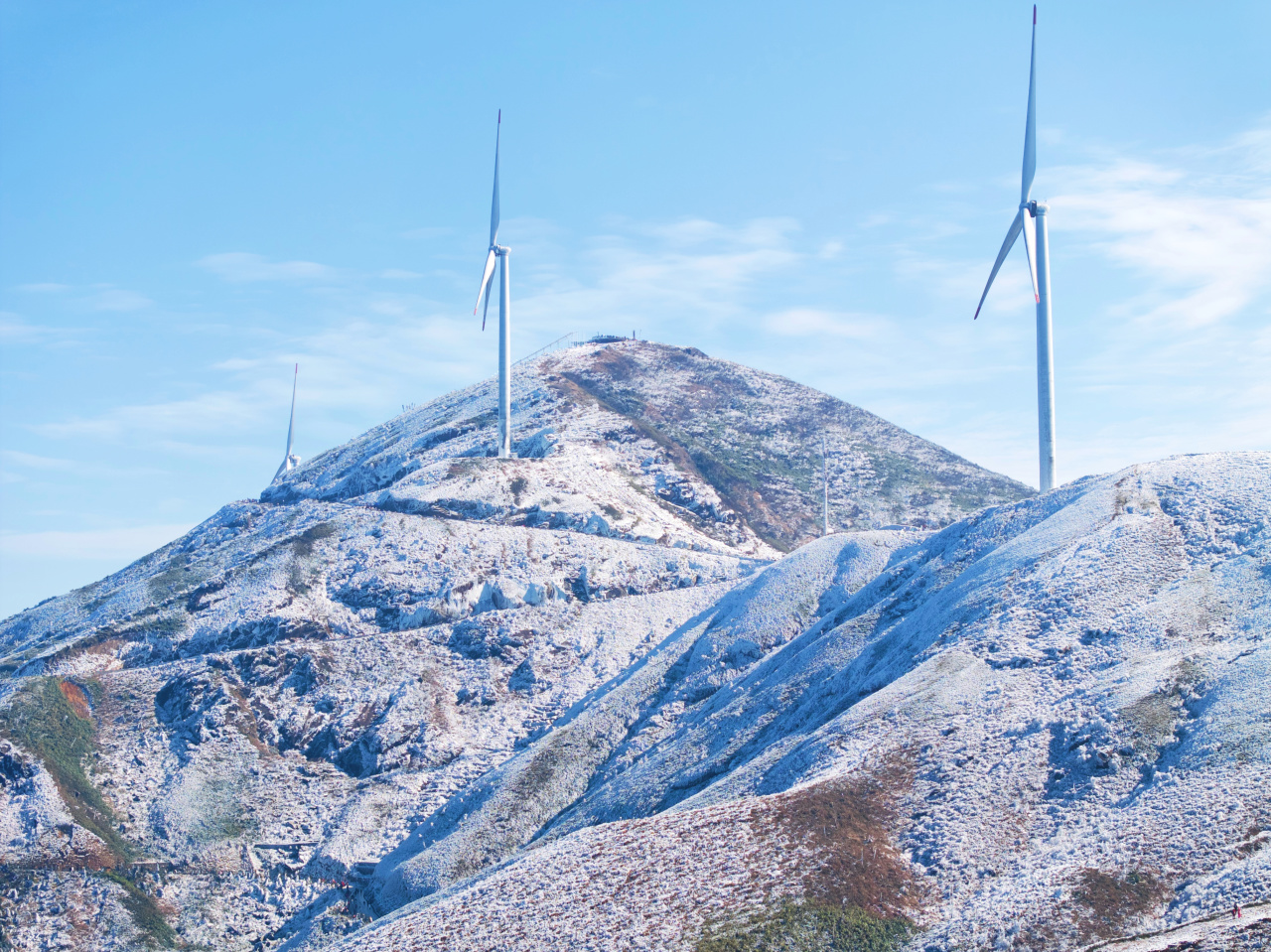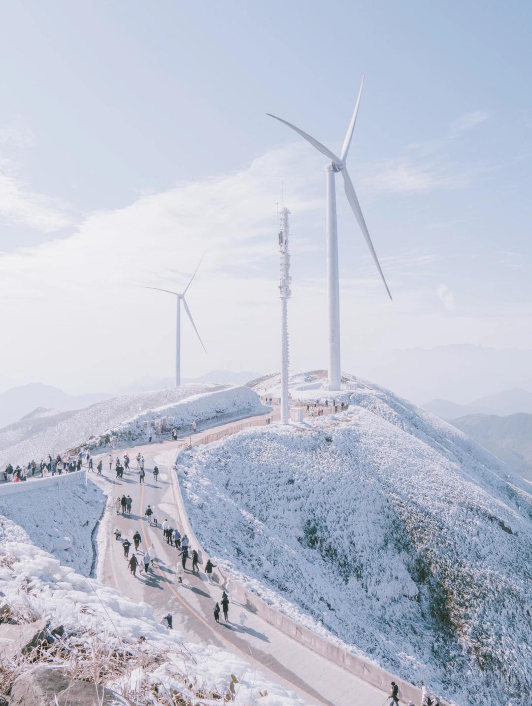 520级木栈道拾级而上,寓意"一路走到白头",牵手登顶便可以同时踏在湖南和广东的土地上。冰雪中的风车转动,随手拍都是冬日电影帧。