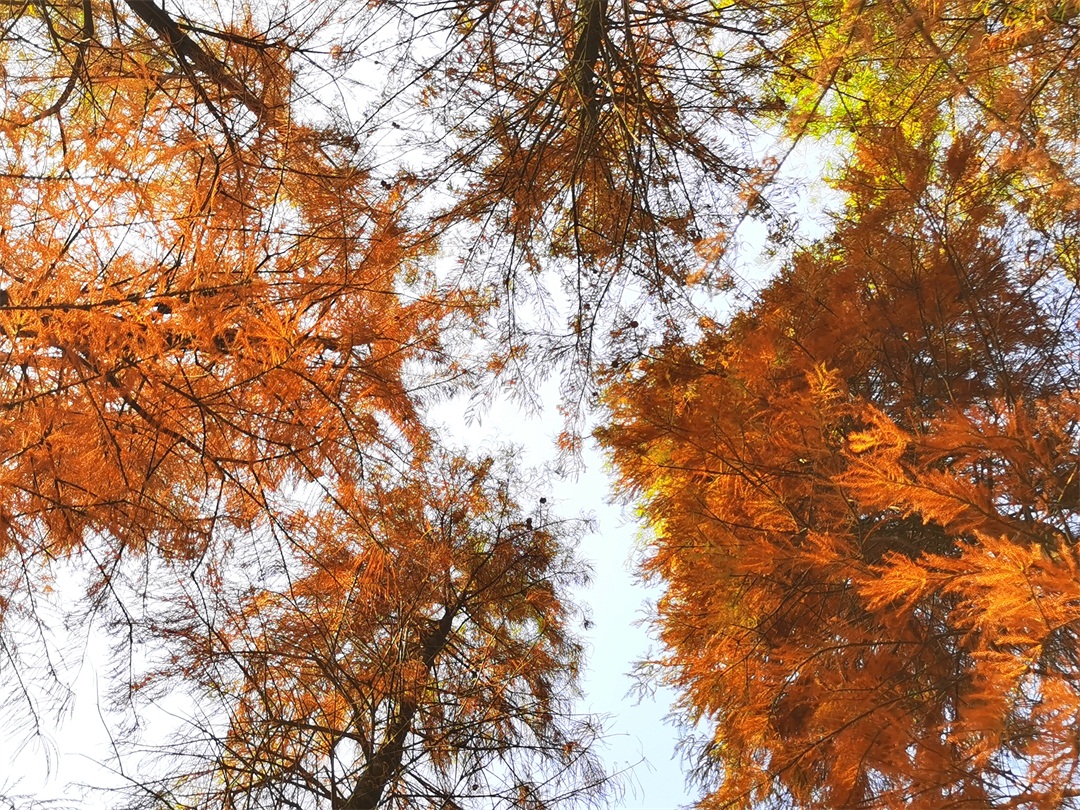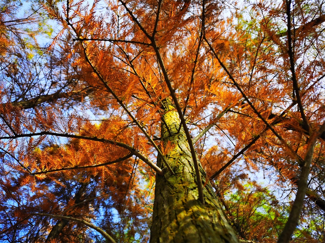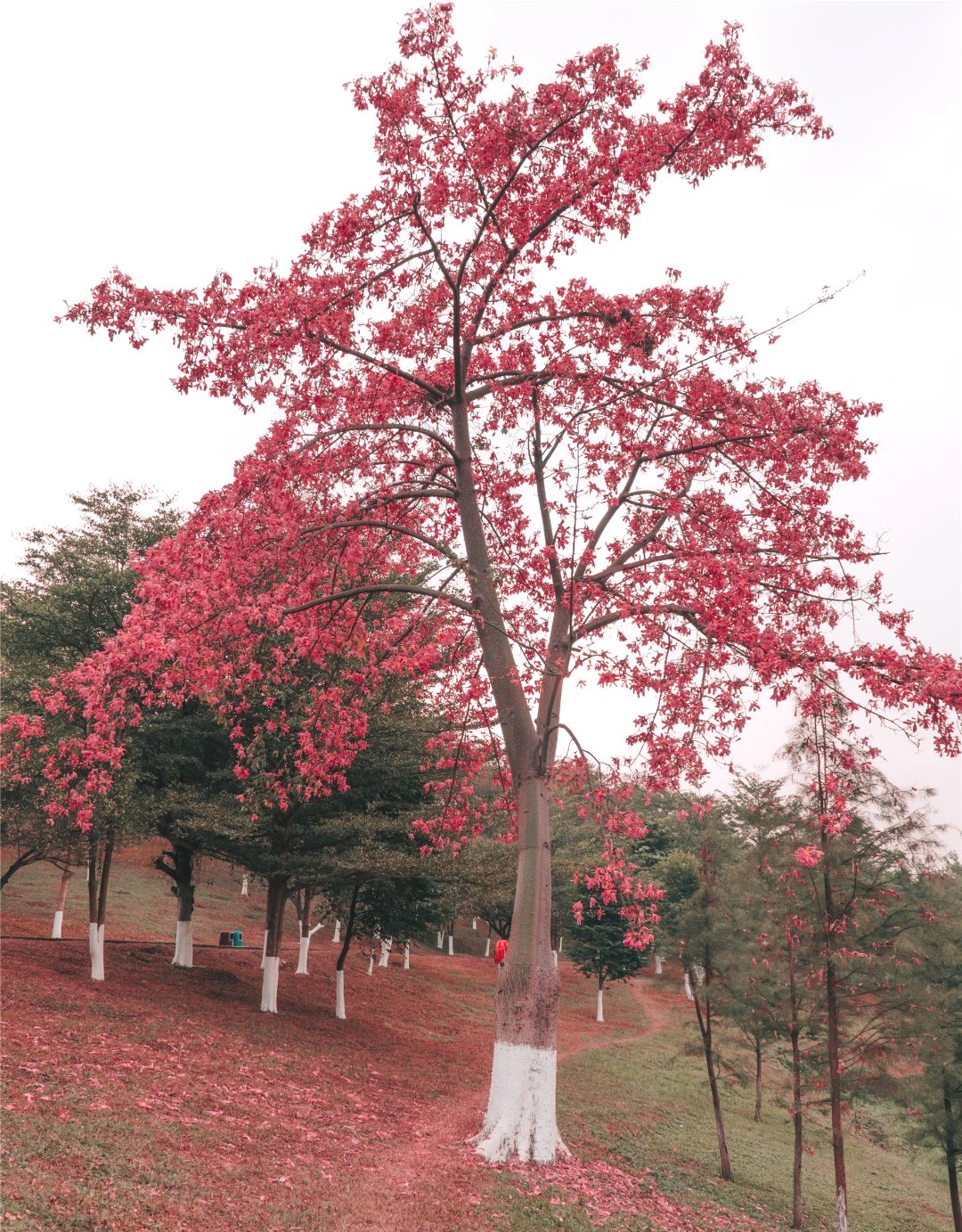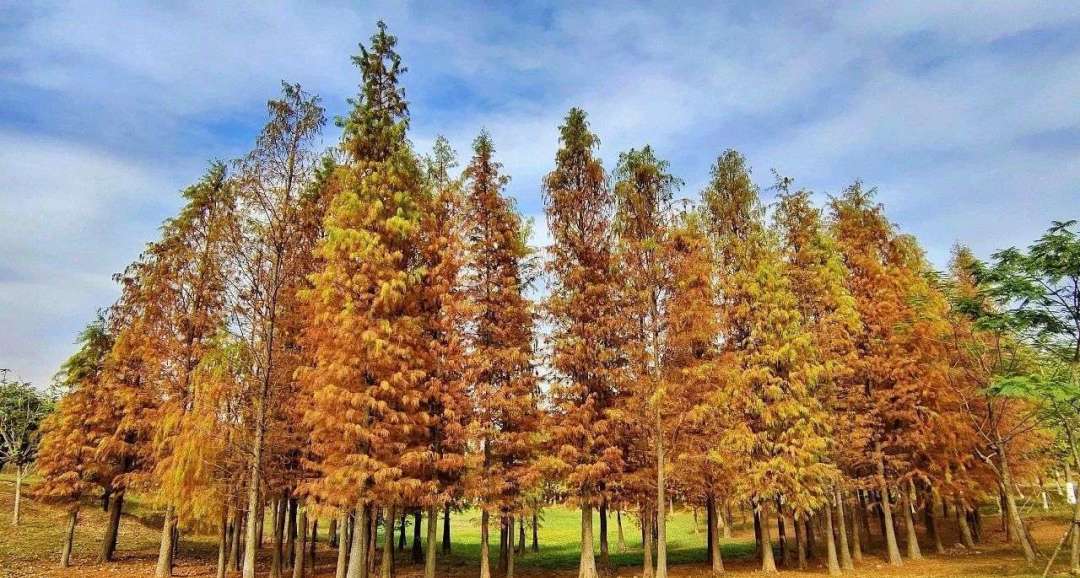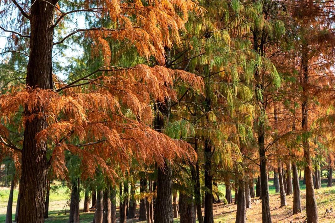 异木棉花开得正茂盛,落羽杉又怎会“无动于衷”呢?