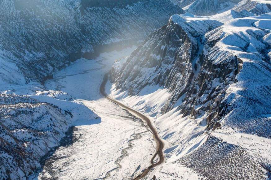 第二站抵达月亮湾,月亮湾有几处反“S”状弯河曲组成的半月牙河湾,这里美丽静谧恰似似弯,被称为“月亮湾”。月亮湾是卧龙湾河曲的延伸部分,冬季的月亮湾,安静的被白雪覆盖,恰如天上被云层遮挡的明月,吐纳着氤氲的气息。