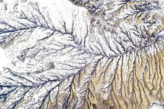 玩够了开始下山,在喀纳斯蜿蜒的山路上行驶,两侧便是已被白雪覆盖的喀纳斯河。喀纳斯河在山谷中蜿蜒,造就了卧龙湾、月亮湾、卧龙湾等秀丽绝伦的水湾河滩景点,河的上源就是有水怪出没的喀纳斯湖。景色秀丽的喀纳斯三道湾,随着气温降低也结上了厚厚的冰层,风景也从五彩斑斓的西方油画转换为传统水墨山水画。我们第一站首先停靠卧龙湾,当地人称锅底湖,是取其形状象锅底而得名,卧龙湾河湾内发育两个小心滩,像两个巨大的脚印。传说是神仙难以抗拒美景的诱惑,下凡赏景时所留。