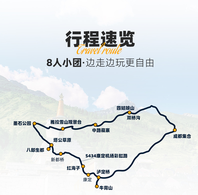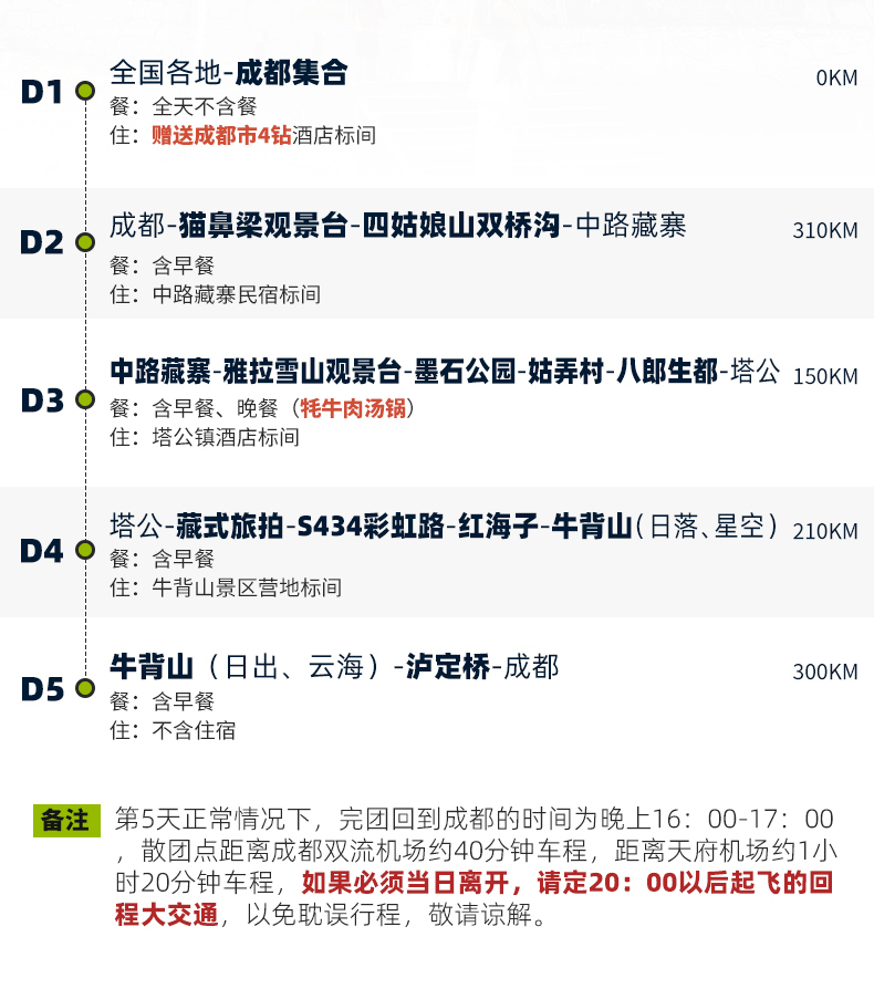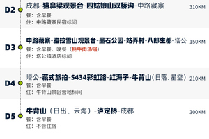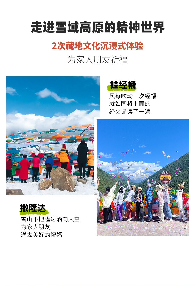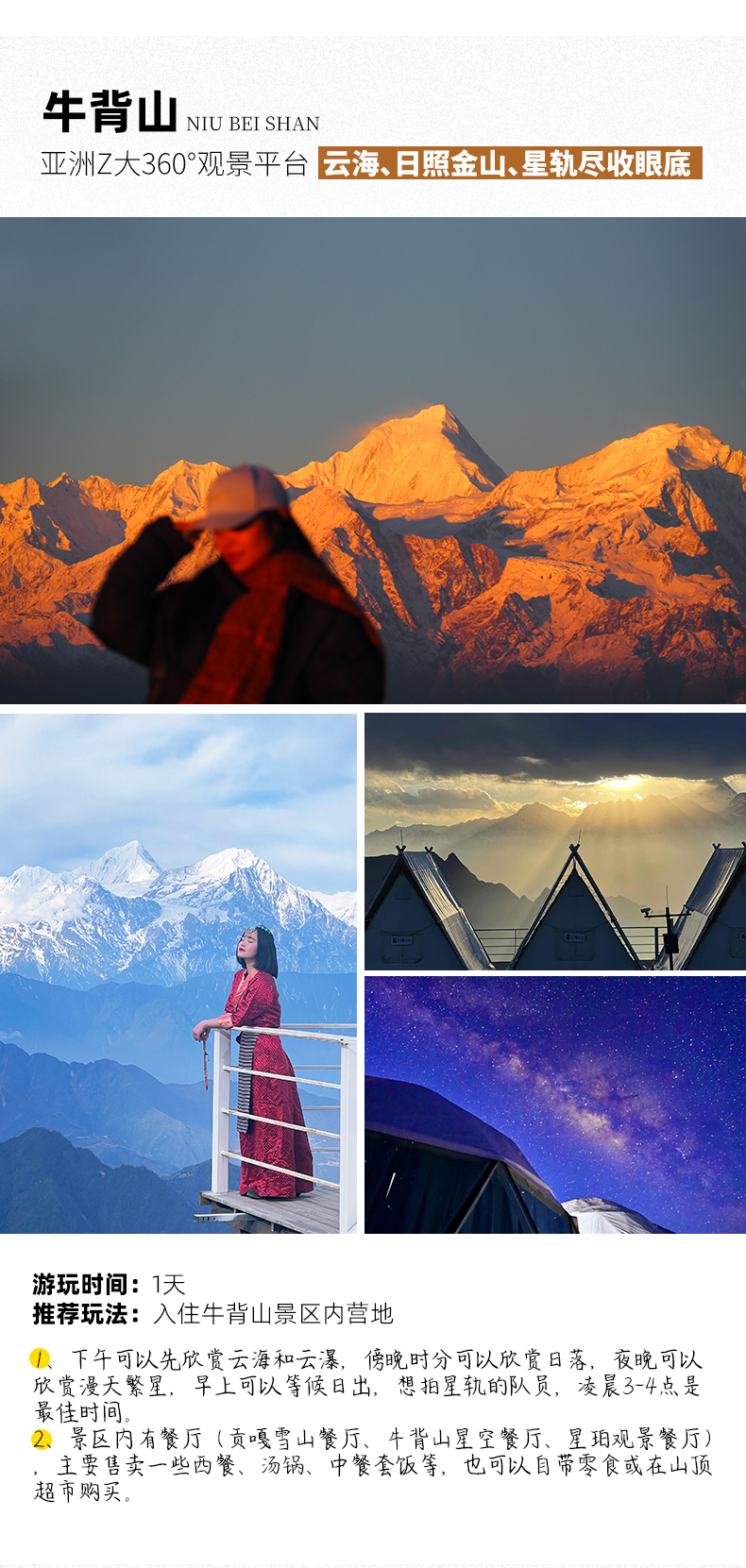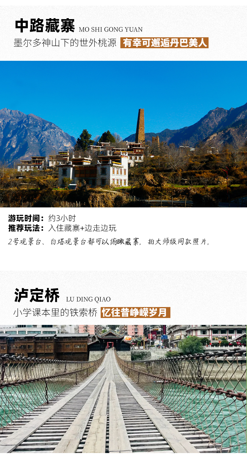 4、景交:四姑娘山双桥沟观光车70元/人(必须);墨石公园观光车20元/人(必须);泸定桥上桥保险5元/人(可选);牛背山转运车100元/人(可选),牛背山卡丁车单程140元/车/双人(可选),目前牛背山免观光车(如后续开始收费请自理);姑弄村、八郎生都、红海子、塔公草原等清洁费30-35元/人暂未收取,如产生需自理;