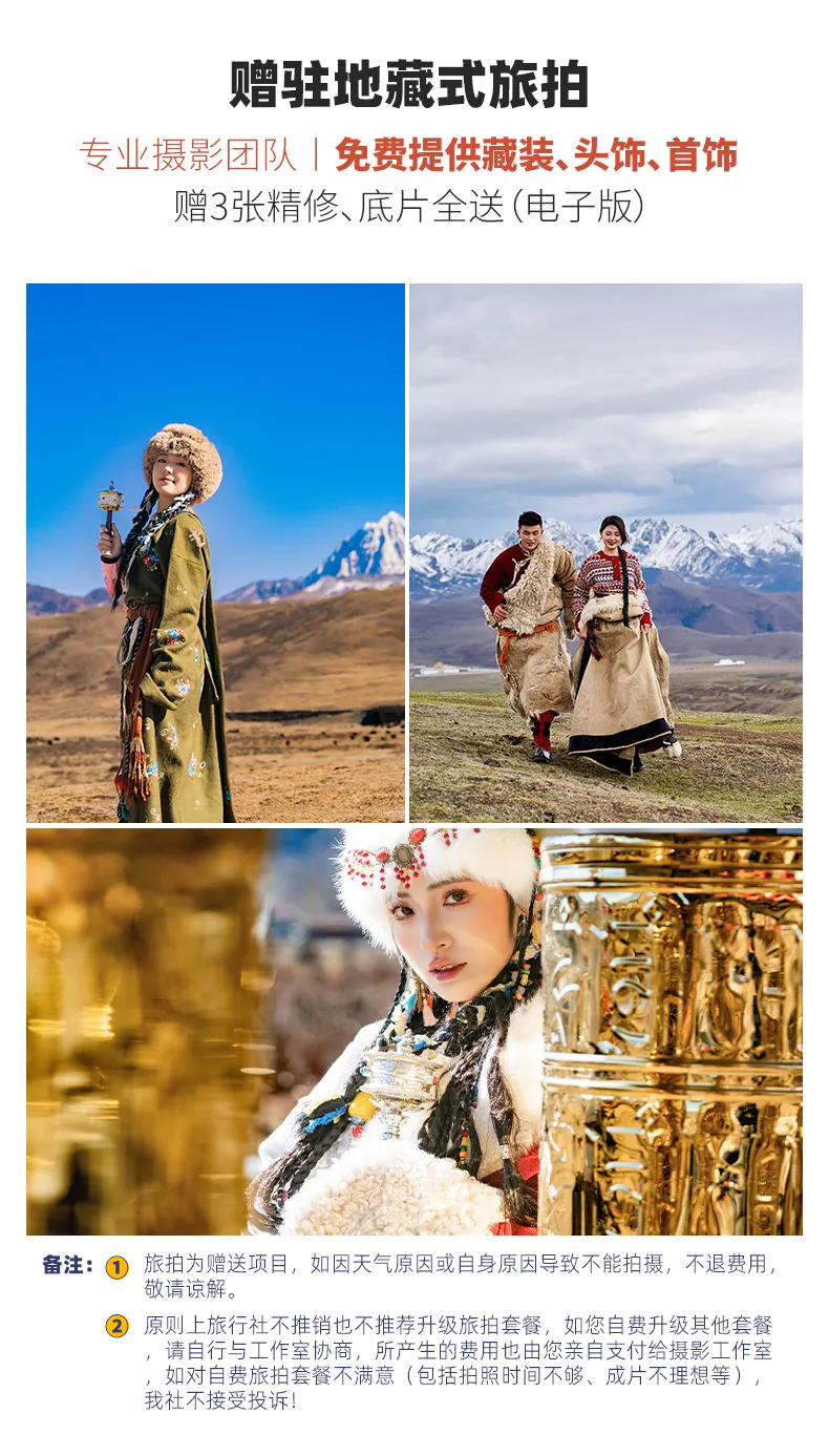 1、驻地藏式旅拍1次(免费提供藏装/首饰/头饰,赠3张电子版简修,底片全送);