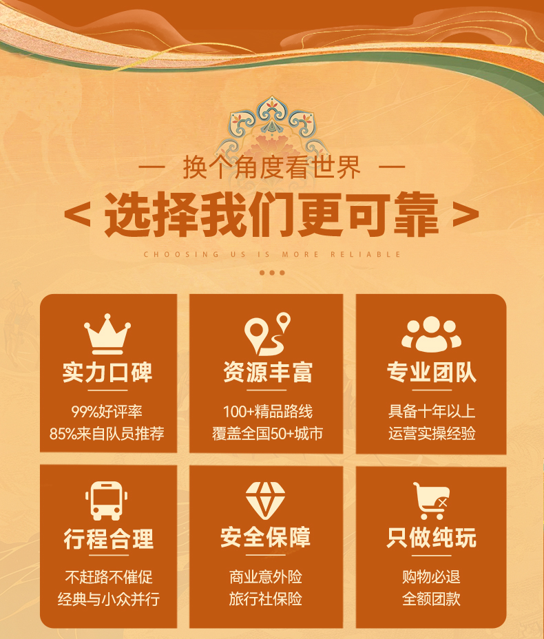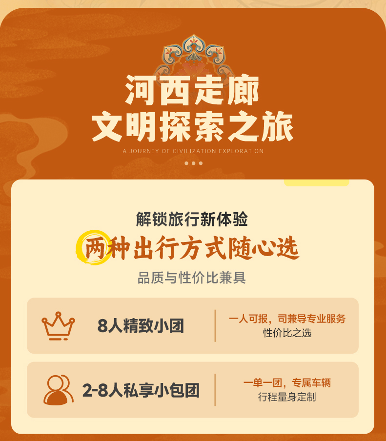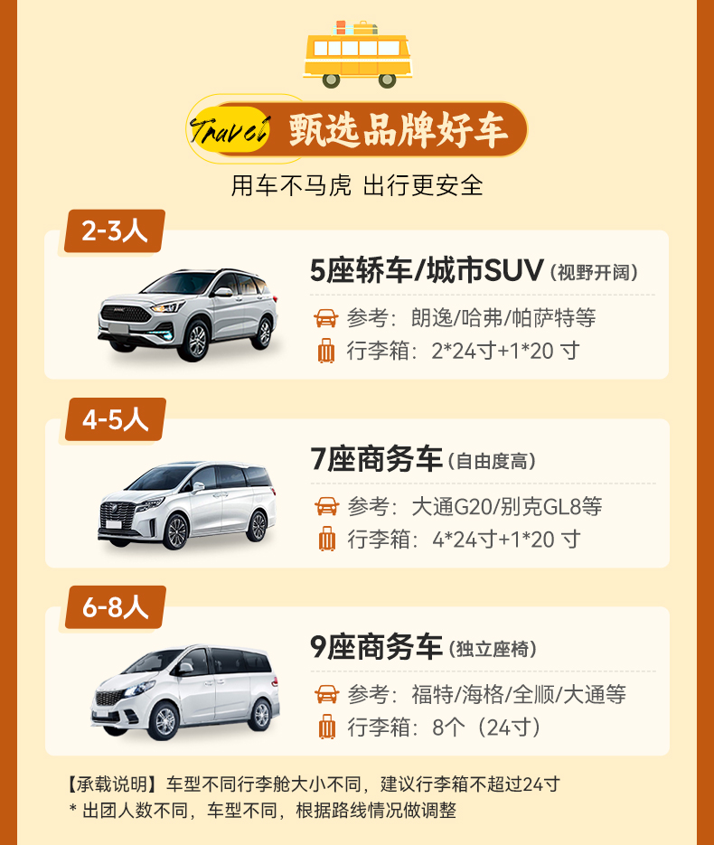 【成团说明】8人小车团:2人成团,8人满团,随走随停;2-8人小包团:一单一团,随时出发(*小车团和私家团均为司机兼向导)