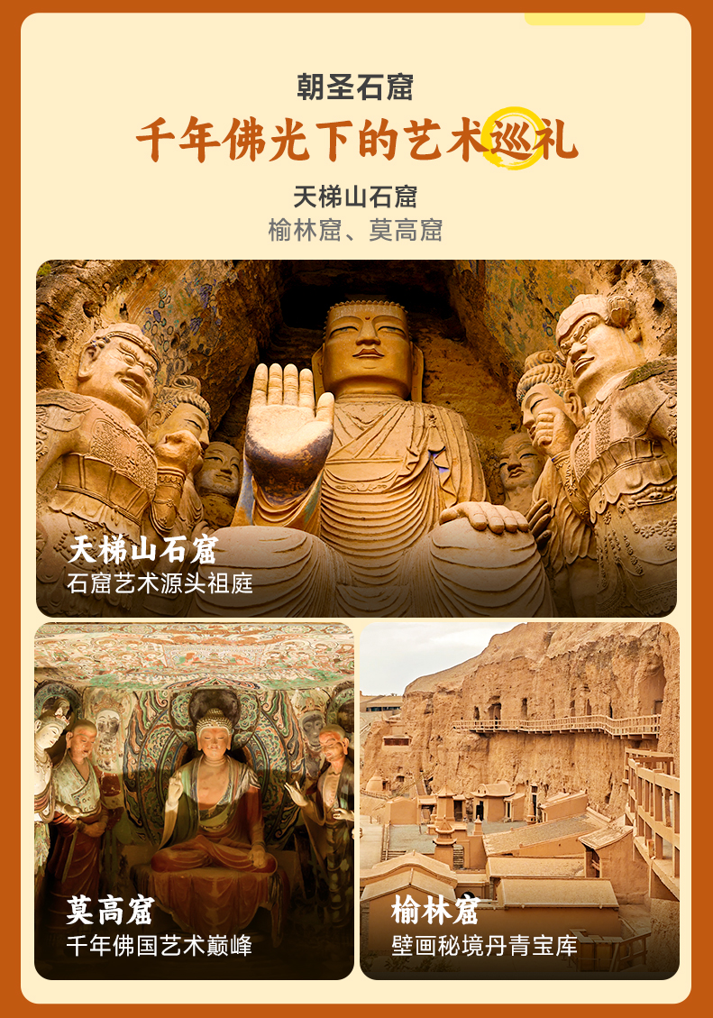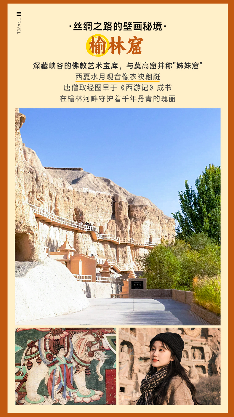 下午,我们前往【榆林窟】(约130公里,车程约1.5小时,游玩时间约3小时),这座深藏在榆林河谷的佛教艺术宝库,与莫高窟并称“姊妹窟”。其保存的西夏水月观音壁画衣带翩跹,唐僧取经图比《西游记》成书更早,在静谧峡谷中延续着丝路丹青的千年传奇。