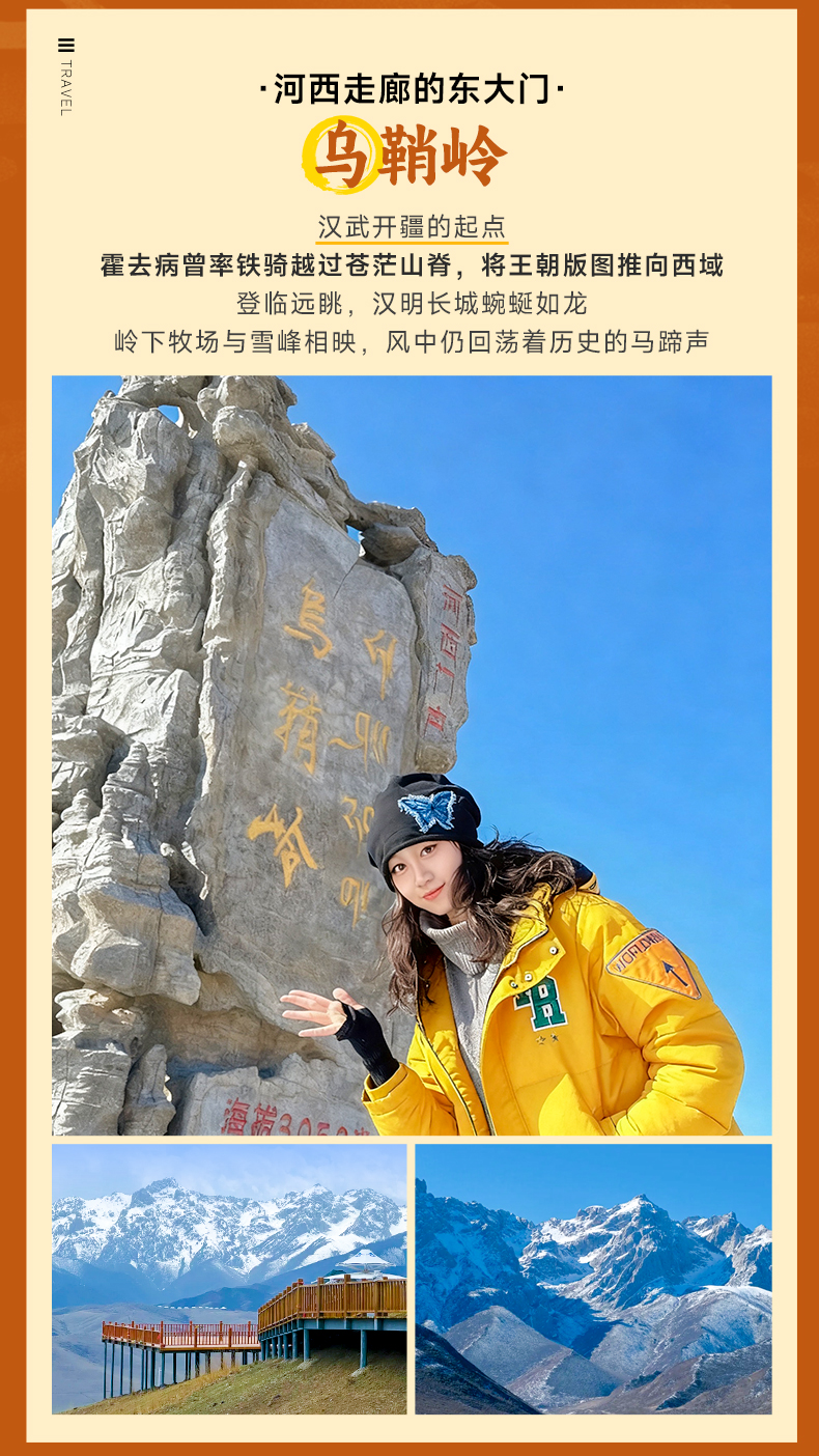 酒店早餐后,兰州启程,沿丝路古道西行,前往河西走廊的东大门,探访【乌鞘岭】(约260公里,车程约3.5小时,游玩时间约1小时)登临海拔3000米的汉武开疆起点,踏足霍去病铁骑曾跨越的苍茫山岭。在这里远眺汉明长城遗址蜿蜒如龙,感受岭下牧场与雪峰相映的壮阔景观。