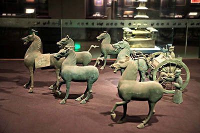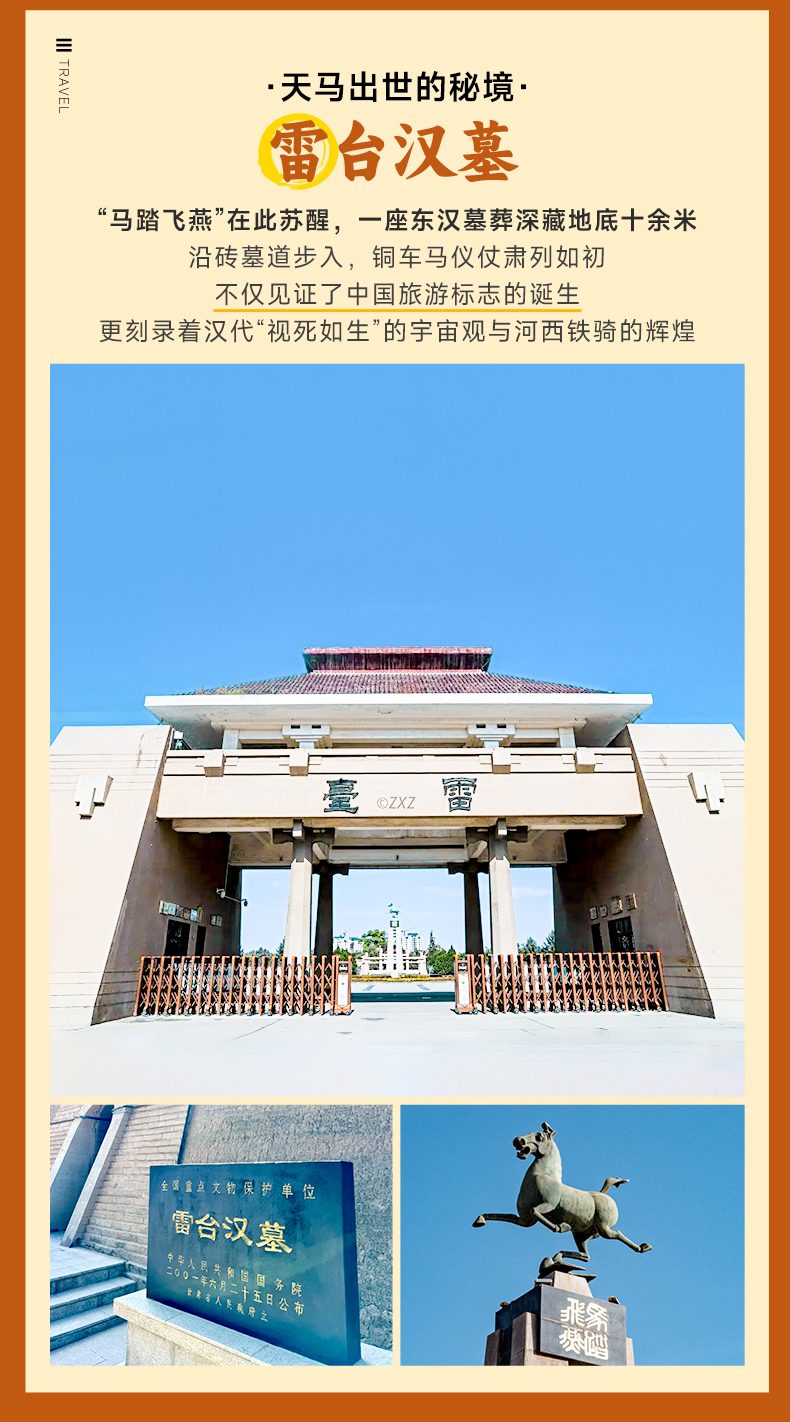 下午,前往【雷台汉墓】(约50公里,车程约1小时,游玩时间约1.5小时),深入东汉墓葬遗址,追寻"马踏飞燕"出土地的历史现场;观摩99件铜车马仪仗俑阵列,感受"地下博物馆"的震撼,解读汉代"视死如生"的宇宙观与河西走廊的军事繁荣。