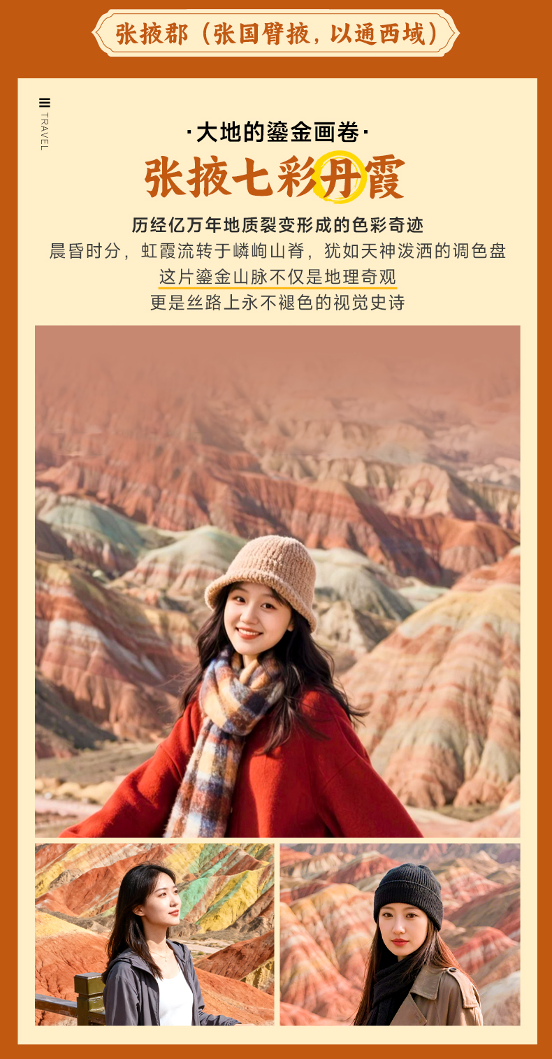 早餐后,我们前往【张掖七彩丹霞】(约40公里,车程约1小时,游玩时间约2小时),这片全球唯一的丹霞地貌与彩色丘陵复合区,历经侏罗纪至今的氧化还原环境交替演变,形成25种细腻色带,宛若"天坠彩练"。其命名源自地质学家冯景兰对岭南"丹霞层"的开拓性研究,标志着中国地貌学独立研究的起点,见证着亿万年地质演化的自然史诗。