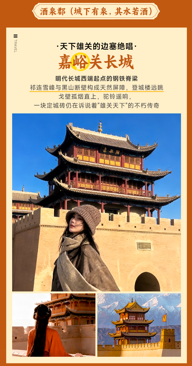 下午,前往【嘉峪关关城】(约190公里,车程约2.5-3小时,游玩时间约2小时),这座明代长城西端的"天下第一雄关",坐落于祁连山与黑山之间的峡谷要冲,巍峨城楼与绵延城墙共同构筑起古代军事防御体系的巅峰之作。站在城楼远眺,戈壁苍茫,犹闻当年戍边将士的金戈铁马之声。