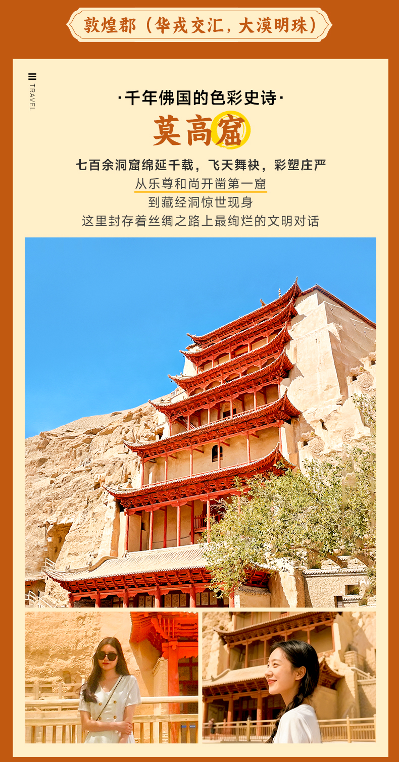 酒店早餐后,前往世界文化遗产【莫高窟】(约25公里,车程约30分钟,游玩时间约4小时)。这座世界上现存规模最大、内容最丰富的佛教艺术宝库,历经十六国至元等十个朝代持续营建,集建筑、雕塑与壁画艺术于一体,被誉为"沙漠中的美术馆"。景区由数字展示中心与石窟群两部分组成:先在展示中心观看高清纪录片《千年莫高》与球幕影片《梦幻佛宫》,随后跟随专业讲解员走进8个实体洞窟,仰望彩塑,凝视飞天,仿佛看见乐尊和尚在岩壁上凿刻第一个石窟时飘动的僧衣,见证丝路文明在荒凉中点燃的第一缕香火。