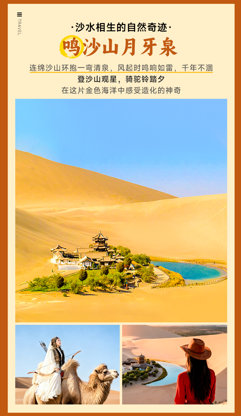 下午,前往【鸣沙山月牙泉】(约6公里,车程约15分钟,游玩时间约3小时)沙山连绵起伏,随风鸣响,其声如雷,相传是因沙粒中的石英晶体摩擦生电,与风蚀形成的孔洞共同作用而产生共鸣;一弯新月般的清泉静卧沙坳,千年不涸,其水源来自地下古河道与断层裂隙的持续补给。这片沙泉共生的奇迹,被古人尊为“佛赐圣水”,王维笔下“大漠孤烟直,长河落日圆”的诗意在此触手可及。