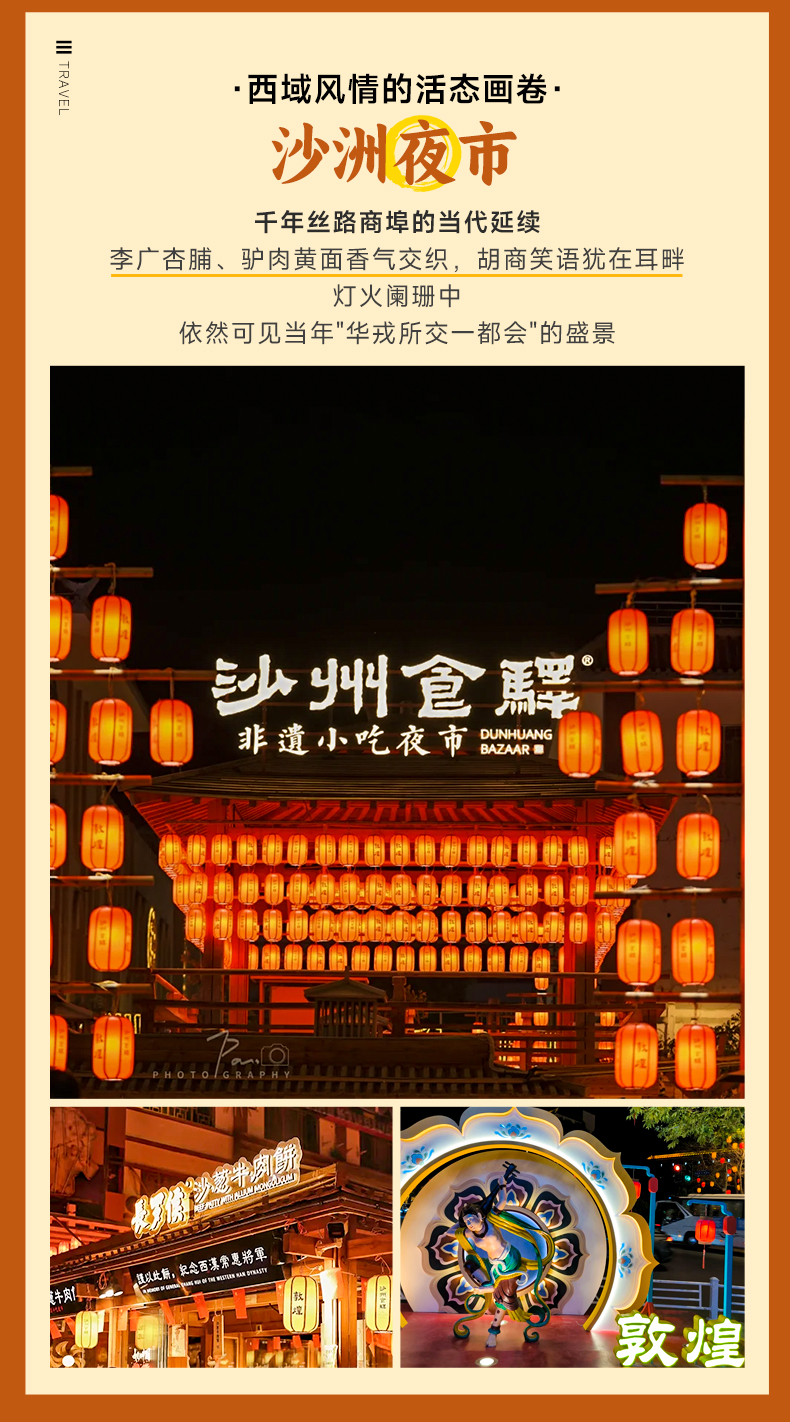 晚上返回市区,逛逛【沙洲夜市】,在灯火阑珊中寻觅李广杏干、夜光杯等丝路特产,感受千年商埠的市井烟火。