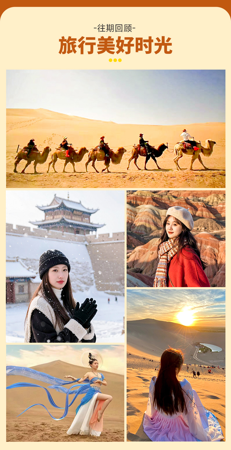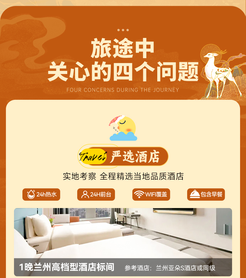 1、交通:兰州出发及敦煌解散的全程专属用车及司机星级服务(含司机餐补、住宿)