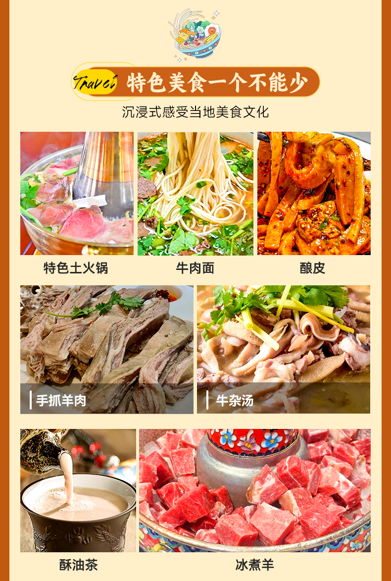 美食推荐:兰州牛肉面、酿皮子、甜胚子奶茶、千层牛肉饼、手抓羊肉、牛奶鸡蛋醪糟、开锅羊肉...