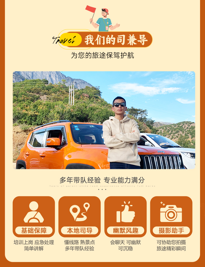 6、领队:司机兼领队,提供向导、代办住宿等服务;无法像专业领队一样提供讲解、景区伴游等服务!