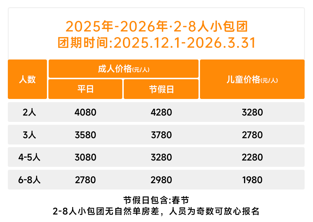 成人:2780元/人;儿童:1980元/人(身高1.2m以下不含床位、早餐、门票)