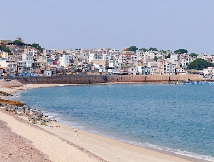 从高处俯瞰,青澳湾犹如一轮弯弯的新月。金黄柔软的沙湾绵延2400米,一直延伸到水下几百米之外。