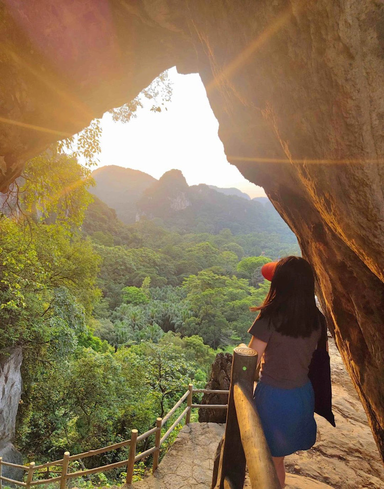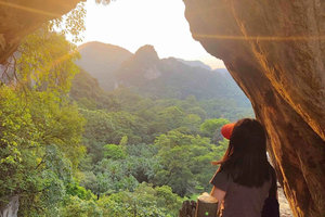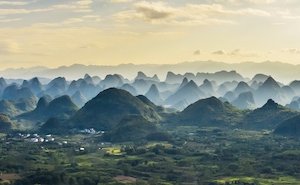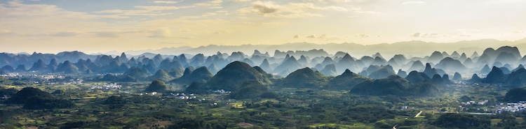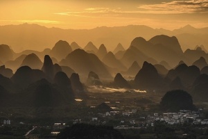 这里是典型的喀斯特峰林地貌,远处一幅气势磅礴、山峰绵延的水墨丹青版千里江山实景图映入眼帘,在夕阳辉映下如梦如幻、美不胜收。