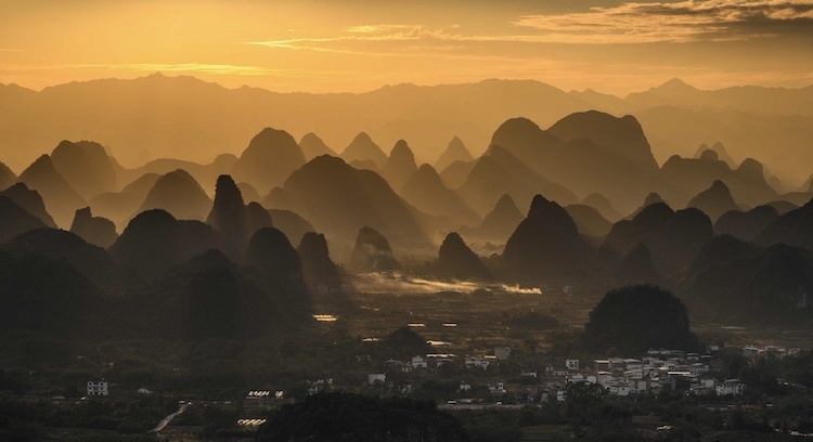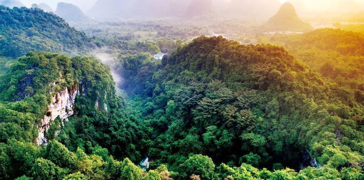 在桂林阳朔有这么一个新晋网红秘境,夕阳泼墨染群峰,山峰绵延宛如现实版“千里江山图”。